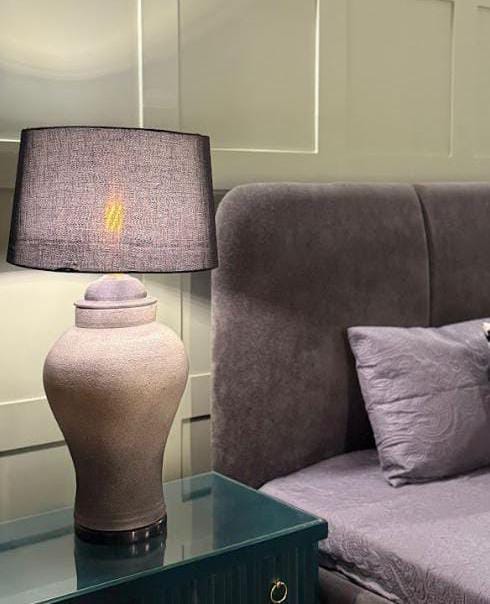 This Hearth Glow Lamp features a subtly textured dark fabric drum shade that casts a warm, downward glow, creating an intimate ambiance. Its substantial base, with a finely textured, earthy finish and a distinct, rounded cap-like detail, evokes the comforting solidity of a hearth. This lamp adds a touch of grounded elegance and cozy illumination, making it ideal for a bedside table or a sophisticated living space.